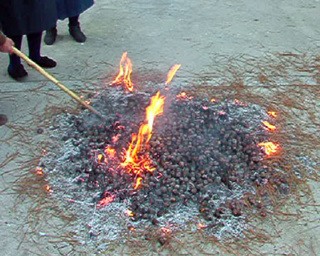 Con una simple fricción de los dedos, las calentitas castañas sacadas de la lumbre, se pelan con suma facilidad. El sabor es extraordinario y entre los asistentes se comenta en qué grupo de ellas están las mejor asadas, habiendo claras diferencias entre las de cada montón y opiniones para todos los gustos sobre cuál es el mejor. Recordando que “la moragá” es una costumbre de la Edad Media, quisimos imaginar cómo podría haber sido esta celebración, allá por el siglo XIII siendo El Hornillo una de aquellas pequeñas aldeas antes mencionadas.
